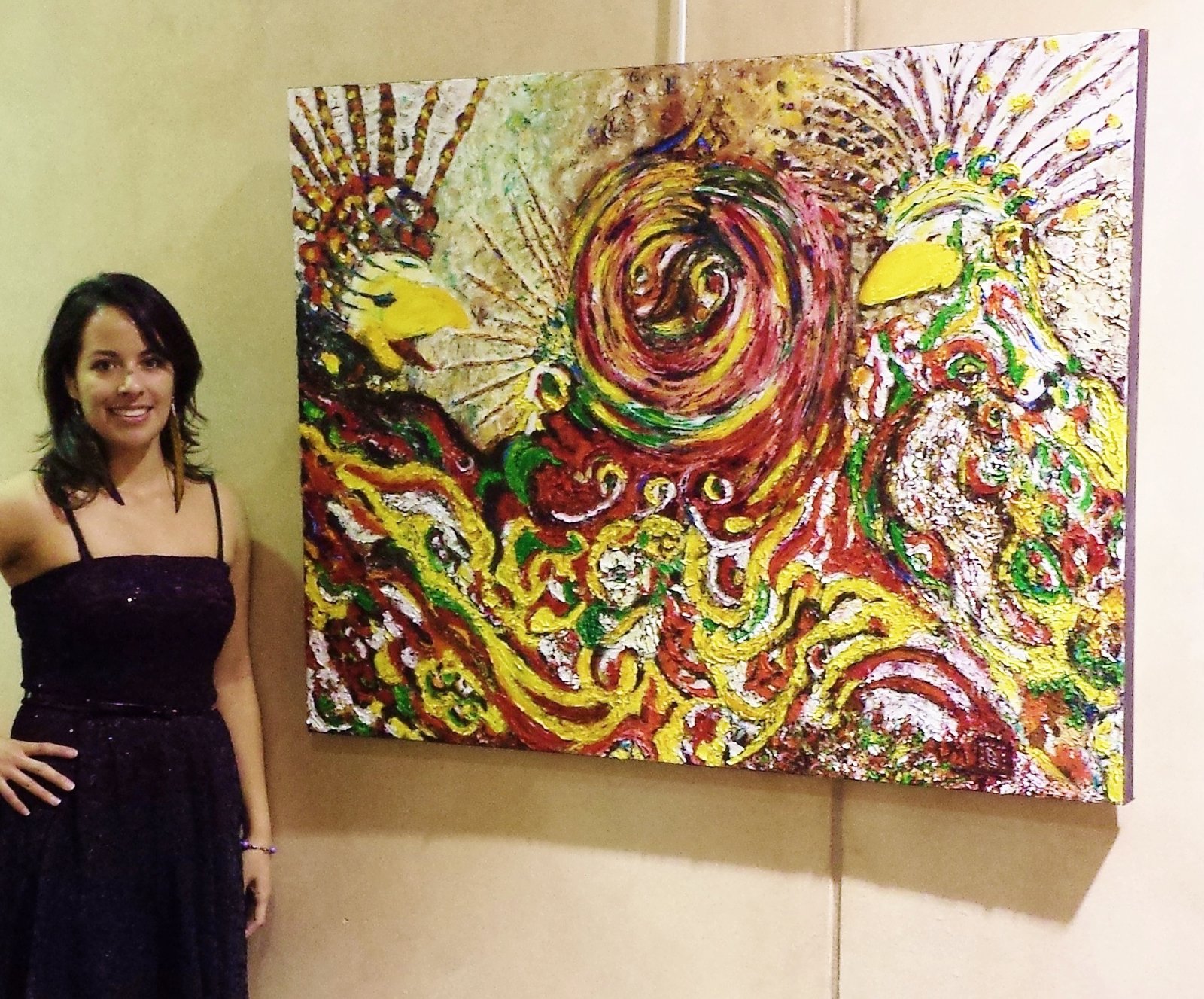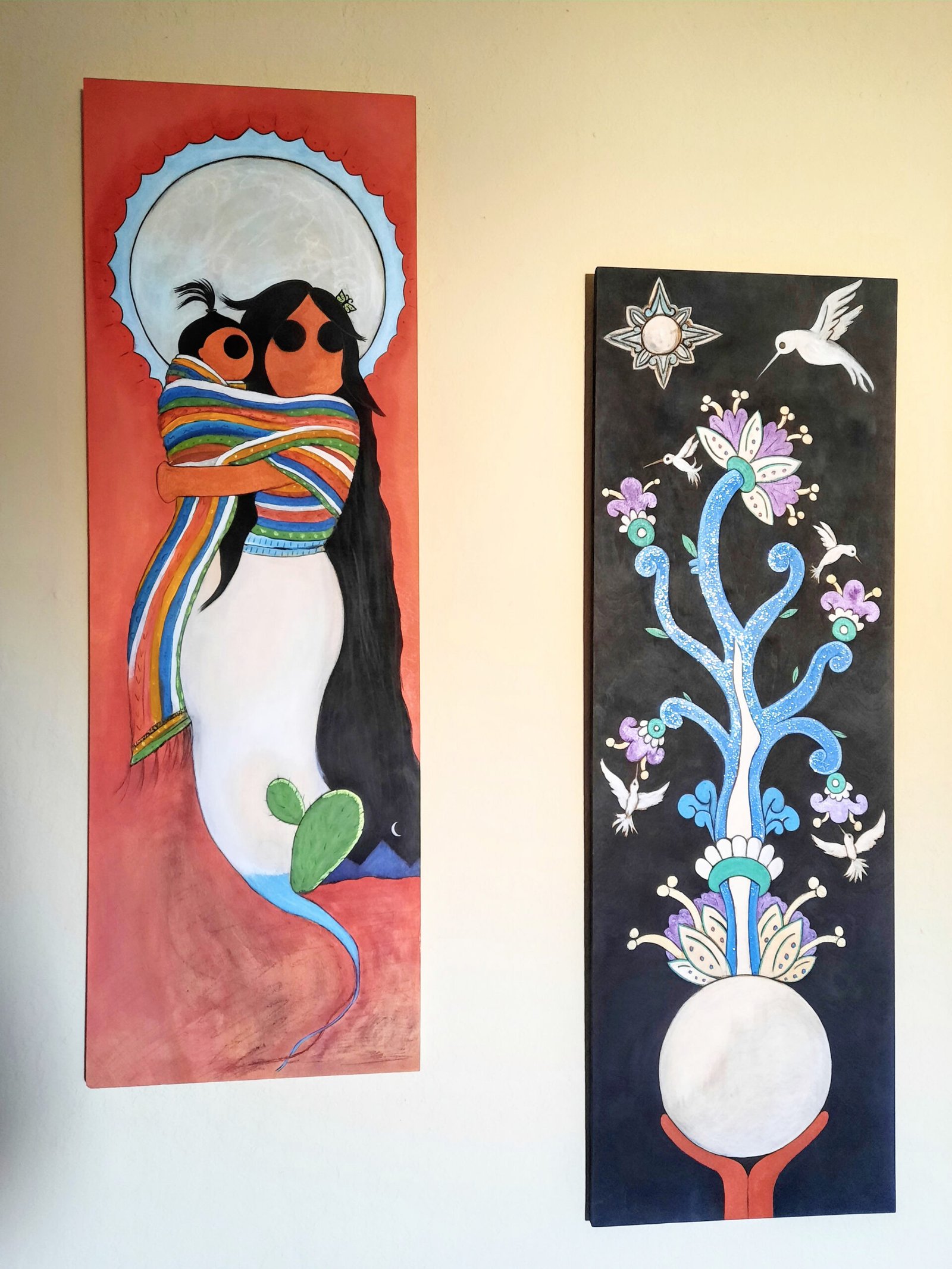 Like my poetry, my visual art also centers themes of identity, culture, and social issues. My poetry and art have come together, most significantly in my project Footless Dancers, which is a series of 13 paintings based on a poem by the same name, with images of indigenous dancers and lines of the poem creatively interwoven. My poetry-artwork The Moon was exhibited in the exhibition Imagine at the Triton Museum in 2014.