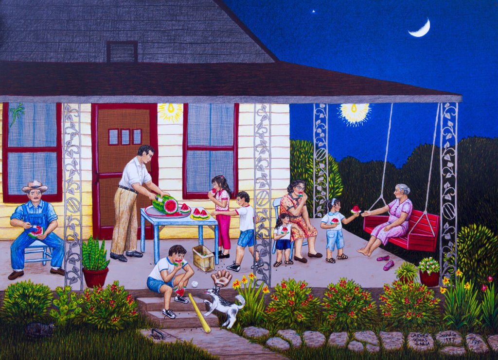 This exhibit will explore the many layers that Chicano art has come to portray in the last 50 years beginning with the closeness of family and the cultural importance of the relationships that are maintained in the Mexican American community. The first gallery will feature prominent artists like Carmen Lomas Garza and Emigdio Vasquez; their beautiful paintings of home life and family portraits reveal the intimacy and variations of the family unit. The following gallery continues with the artistic expression of the political voice that resonated throughout the Civil Rights Movement, and continues in contemporary society, through the work of Rupert Garcia, Ester Hernandez and Juan R. Fuentes. And finally, the last gallery showcases works that have continued with the traditions established by El Movimiento, as well as works that create new visual vocabularies, that redefine past traditions and explore individual feelings of what it is to be bicultural.
