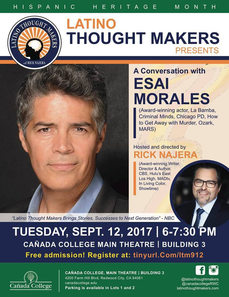Rick Najera’s Latino Thought Makers is coming to the Bay Area next week with a live conversation series with special guest, award-winning actor/activist Esai Morales on Tuesday, September 12, 2017 at Cañada College. The special event, kicking off celebrations for Hispanic Heritage Month, will take place at Cañada College’s Main Theatre at 4200 Farm Hill Blvd, Redwood City, CA 94061 from 6 to 7:30 p.m. with a Q&A following the discussion. Admission to the special event is free and open to the public with registration on EventBrite by visiting http://tinyurl.com/LTM912.